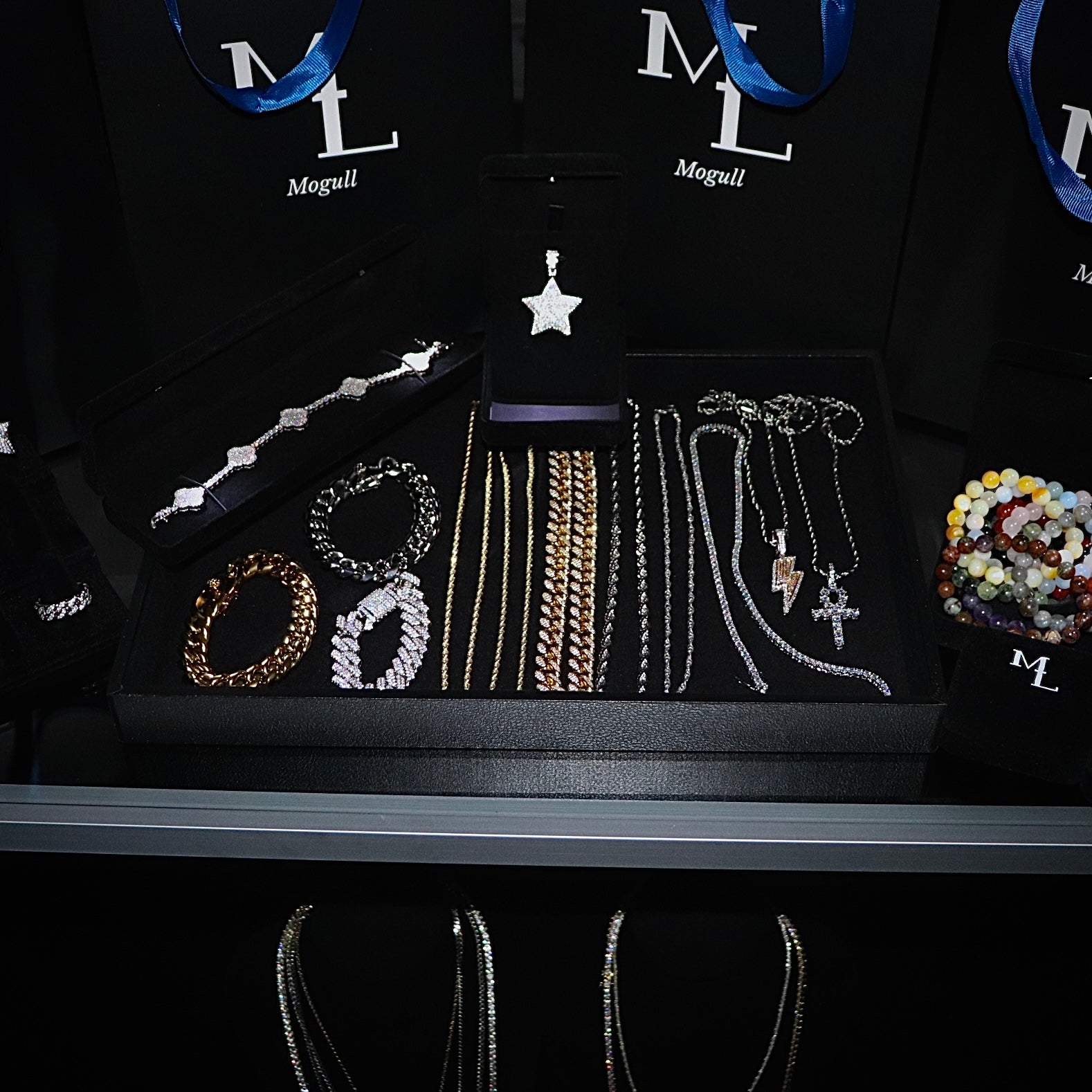 Packaging including signature illuminated black velvet cases and Mogull branded stickers